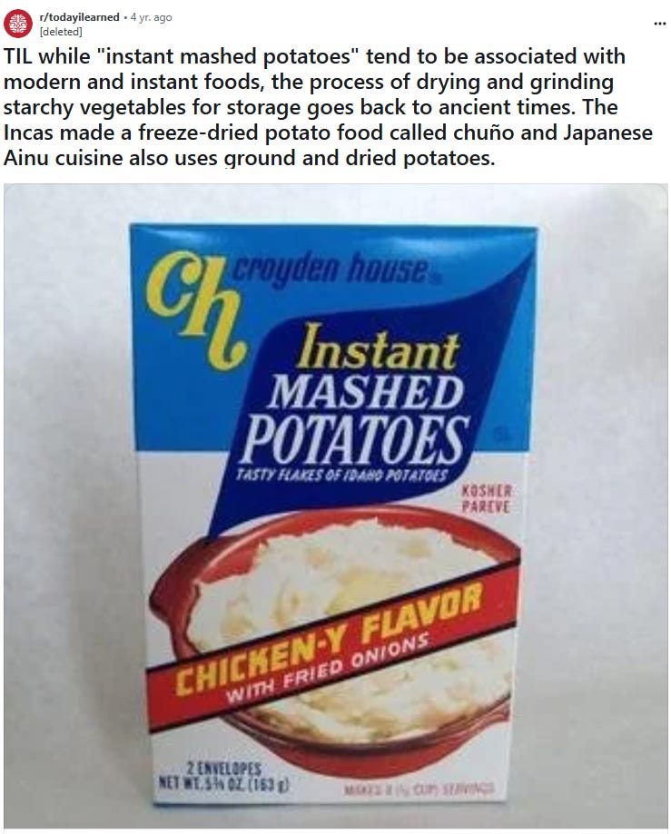 And there is no continuity of purpose, either. To the Andean peoples, chuño was the only way of ensuring that their potato crops would be available well into the future. In America, our indigenous way of achieving this potato security is the entire miracle of modern agriculture and food distribution. I don’t need to stomp on freeze-dried potatoes in the Altiplano to make sure I’ll have access to potato nutrients next year. I just have to rely on the continued existence of Idaho and Target. No, despite what this redditor would like to believe, the instant mashed potato serves some other purpose.