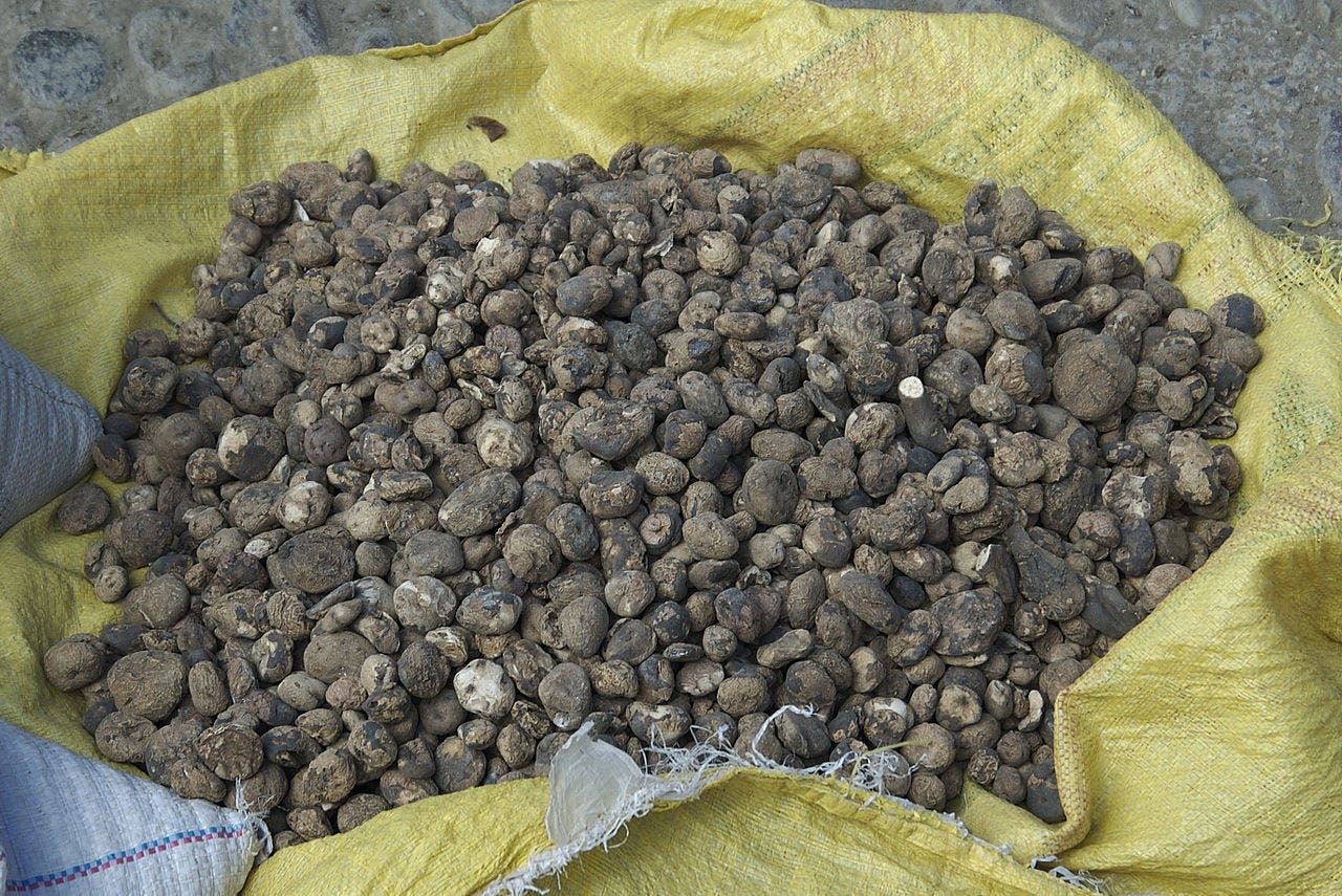 There is a rhetorical sleight of hand happening in this Reddit post title.1 The phrasing implies that chuño resembles modern instant mashed potatoes in some way, that instant mashed potatoes are in some sense continuous with indigenous ways of potato-knowing. But there is no continuity of process, because the way chuño is created has no particular commonalities with the Philadelphia Cook beyond the removal of moisture. There is no continuity of form, for chuño actually looks like this: