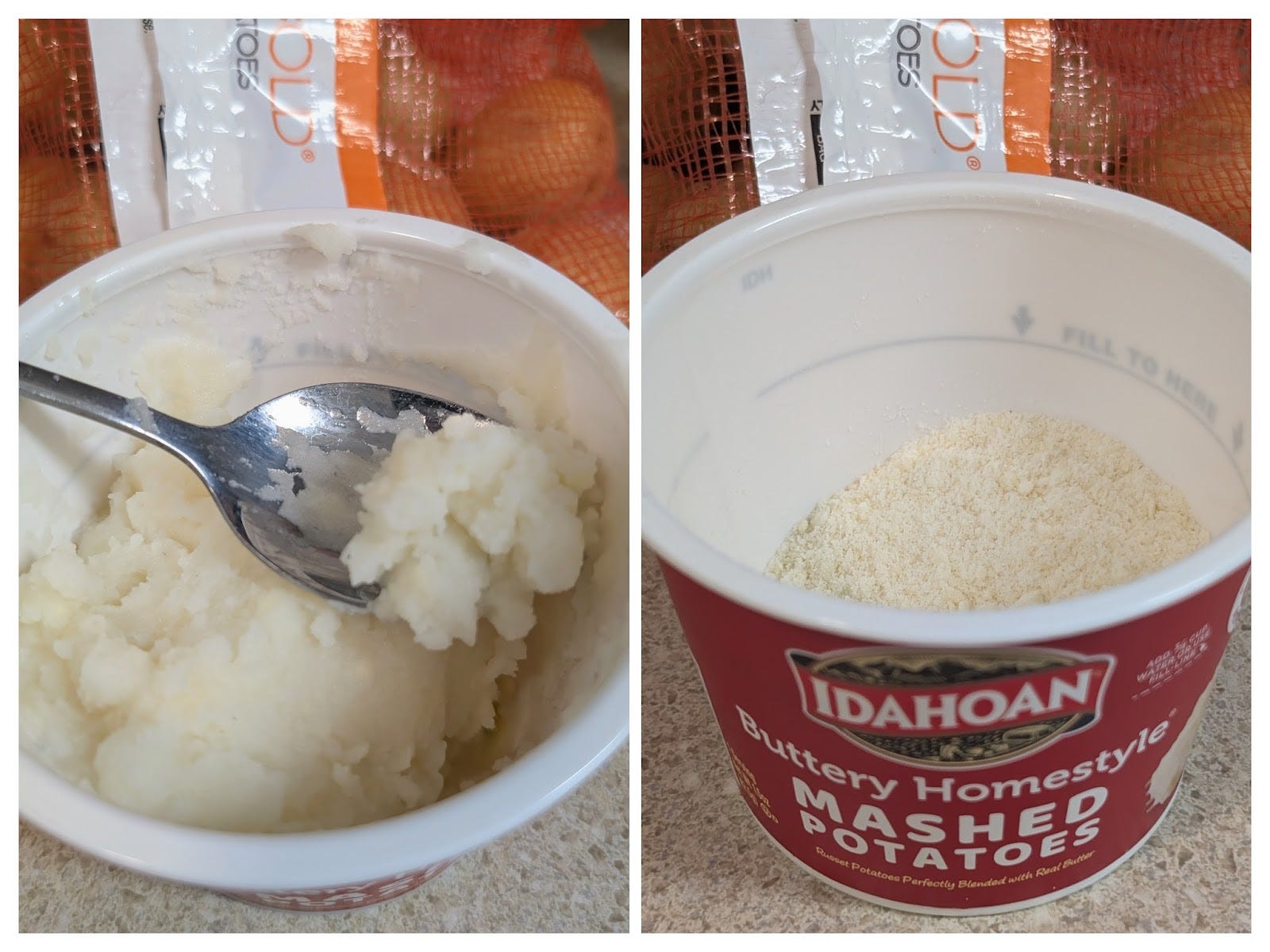 In the interest of full fairness while writing this review, I purchased a plastic cup of my dad’s currently favored “Buttery Homestyle” Idahoan brand instant mashed potatoes for $1.99. The preparation was extraordinarily efficient; the aroma was decent; the taste was a reasonable facsimile; but the texture was all wrong - a smothering paste that coated my mouth and constrained my tongue like a straightjacket. 3/10 would not buy again.