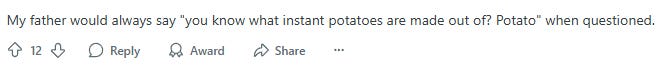 The other factors contributed to the unique awfulness of my father’s instant mashed potatoes, though.